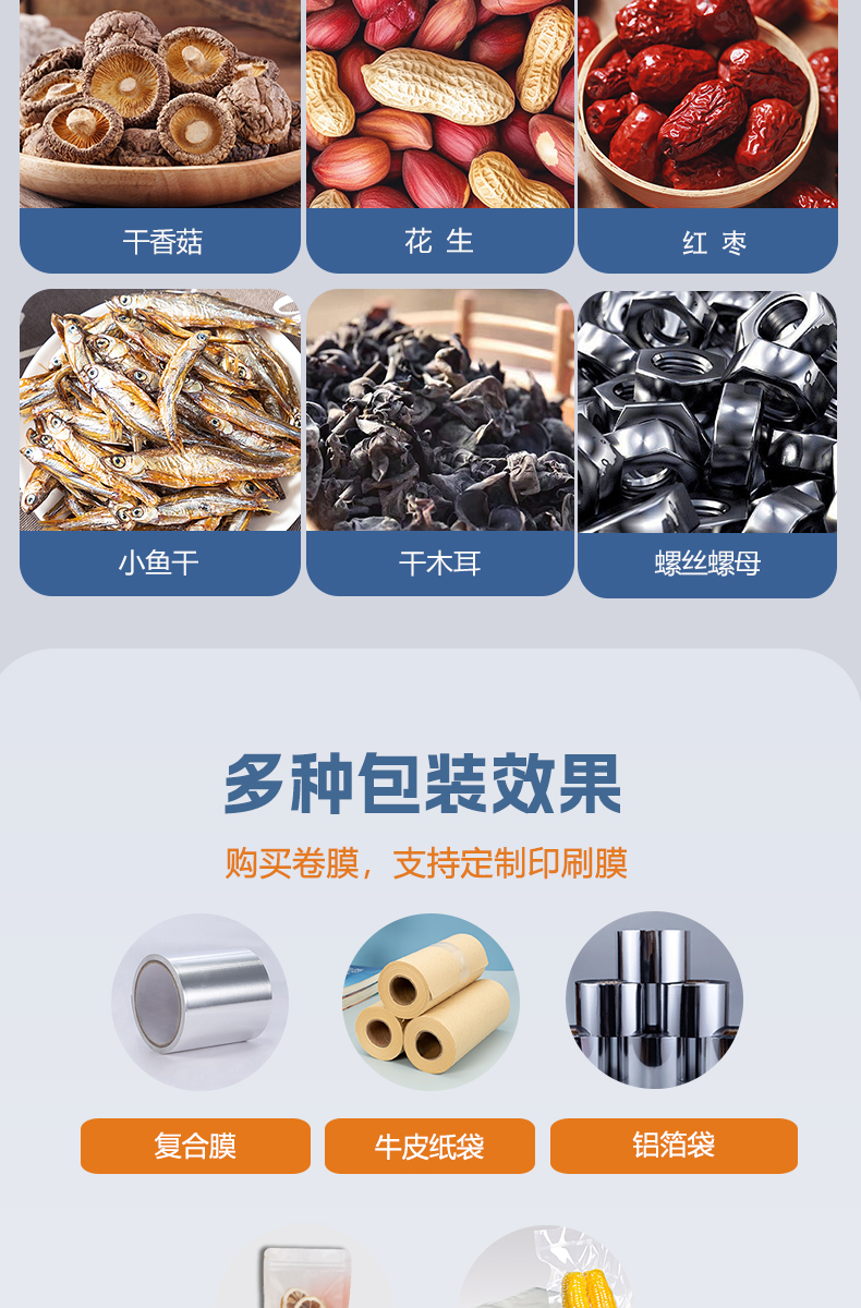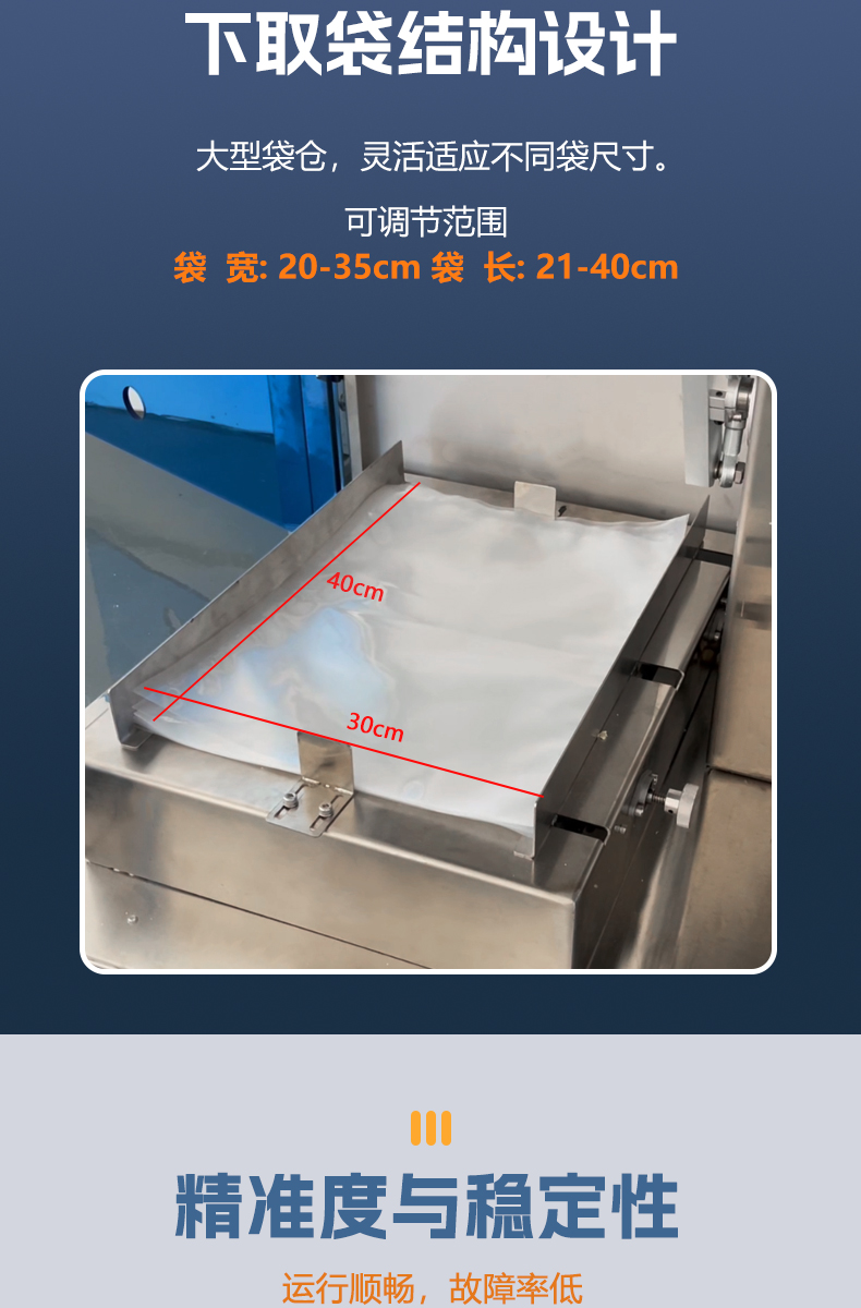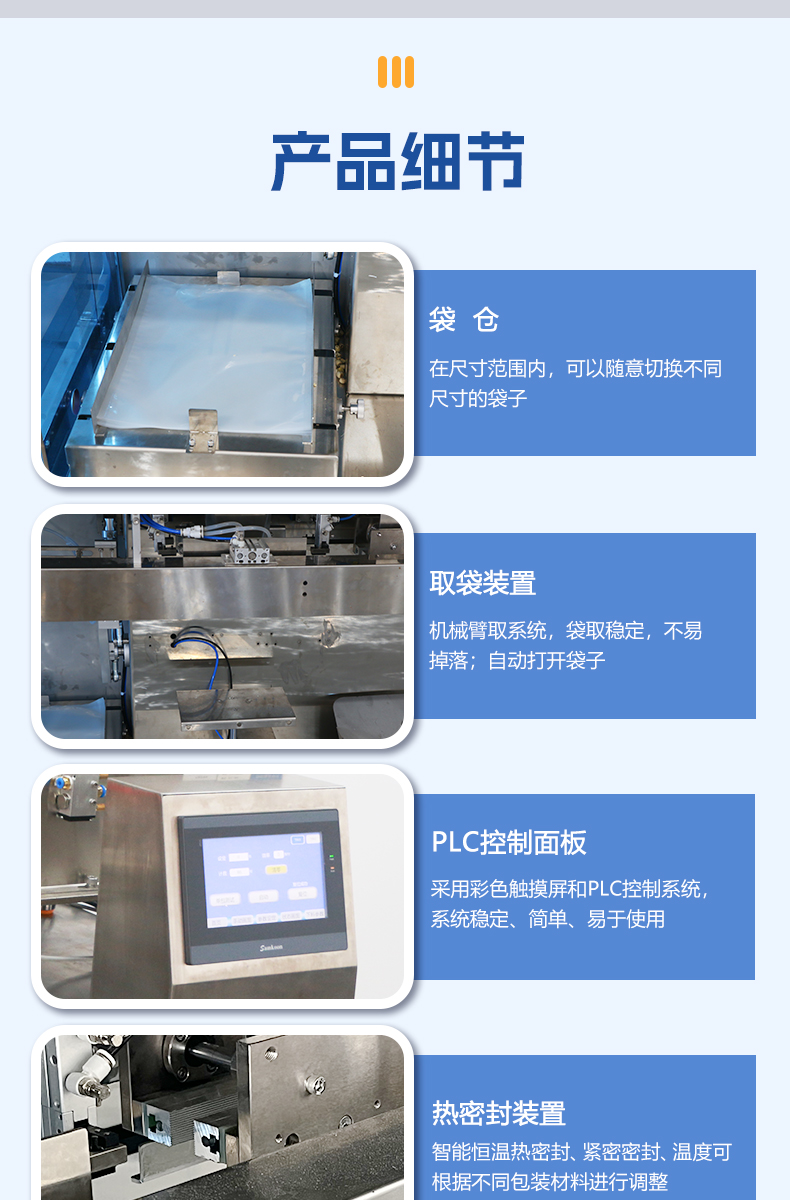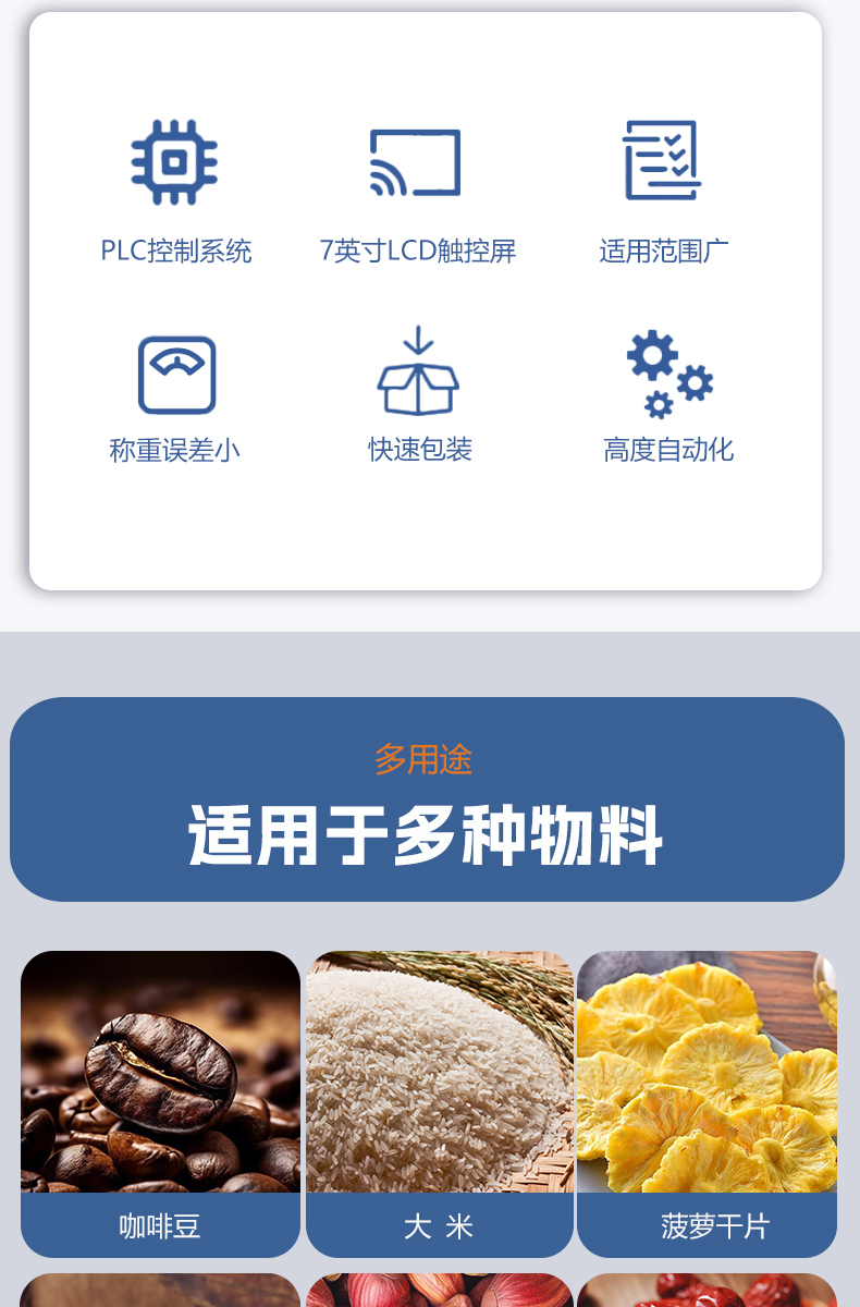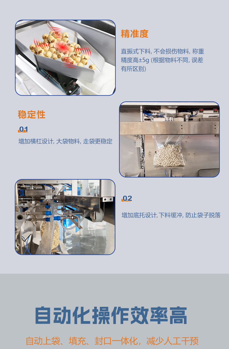 捷鼎3000g超大型顆粒給袋式包裝機(jī)適用于蓮子、堅(jiān)果、咖啡豆、寵物食品等顆粒狀產(chǎn)品的定量、稱重、包裝、填充及封口。包括四面密封袋、直立袋、拉鏈直立袋、平底袋、折邊袋等。